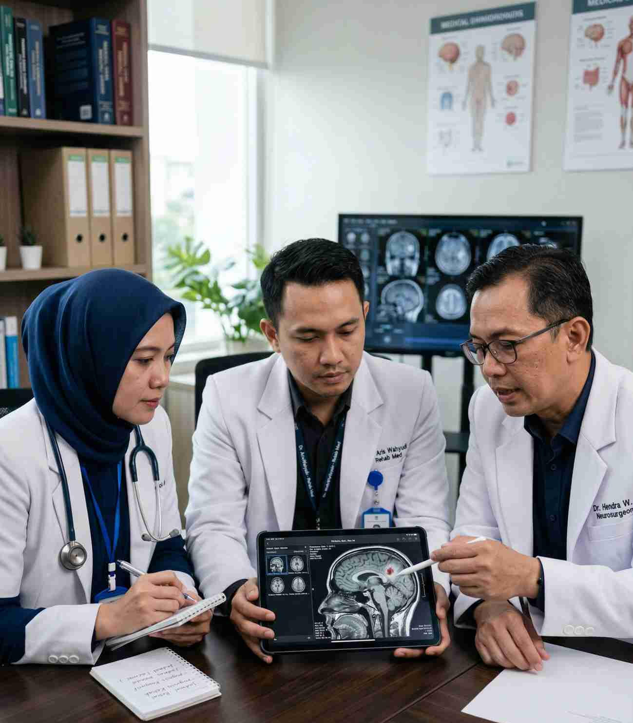 Keputusan medis Anda tidak dibuat oleh satu dokter saja. Tim spesialis bedah saraf, ortopedi, neurologi, dan rehabilitasi bersinergi menentukan jalur pengobatan yang paling tepat, aman, dan dirancang khusus untuk Anda.